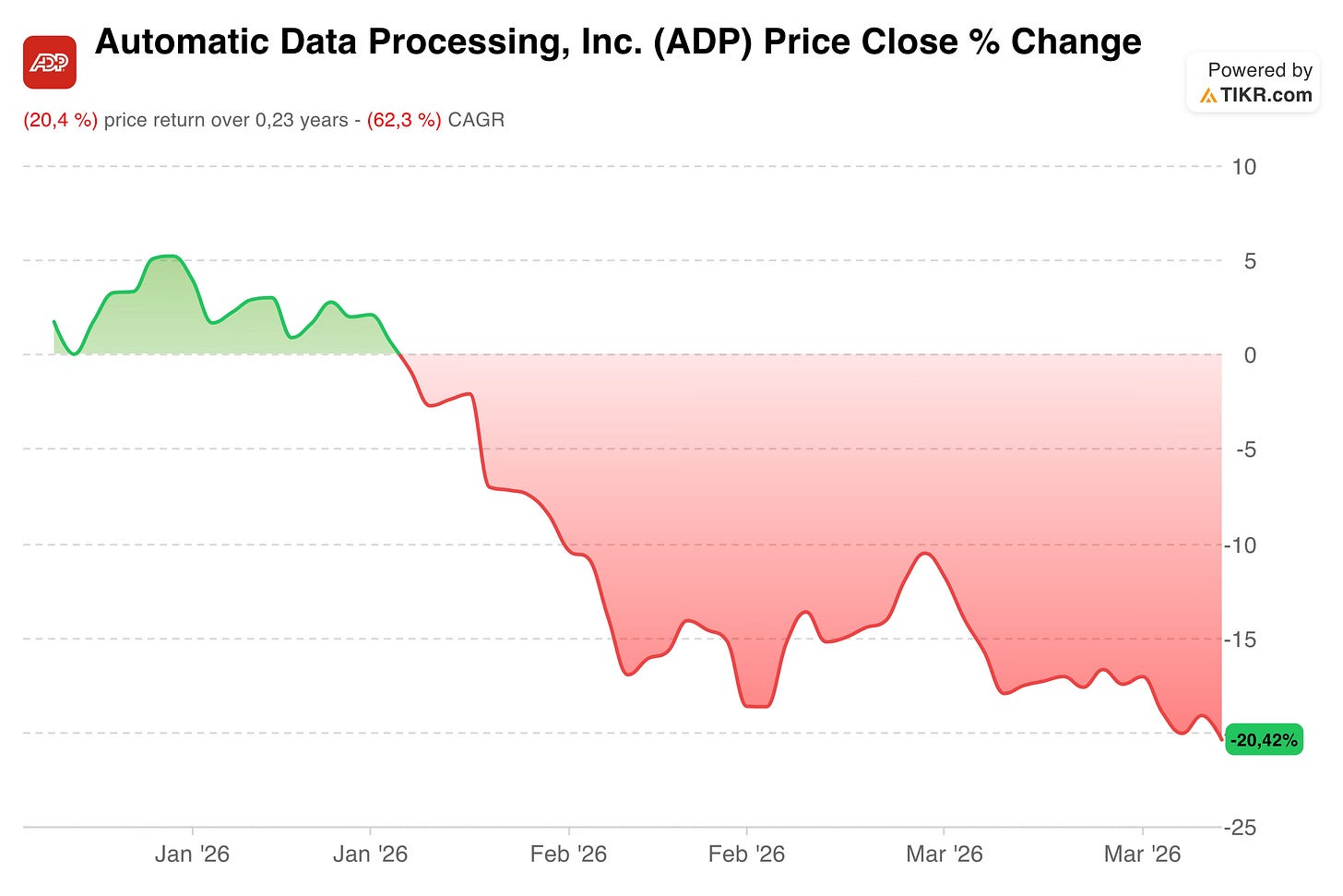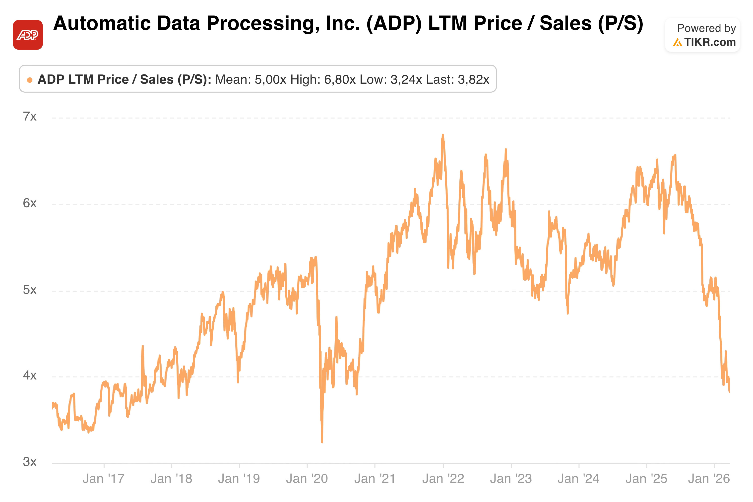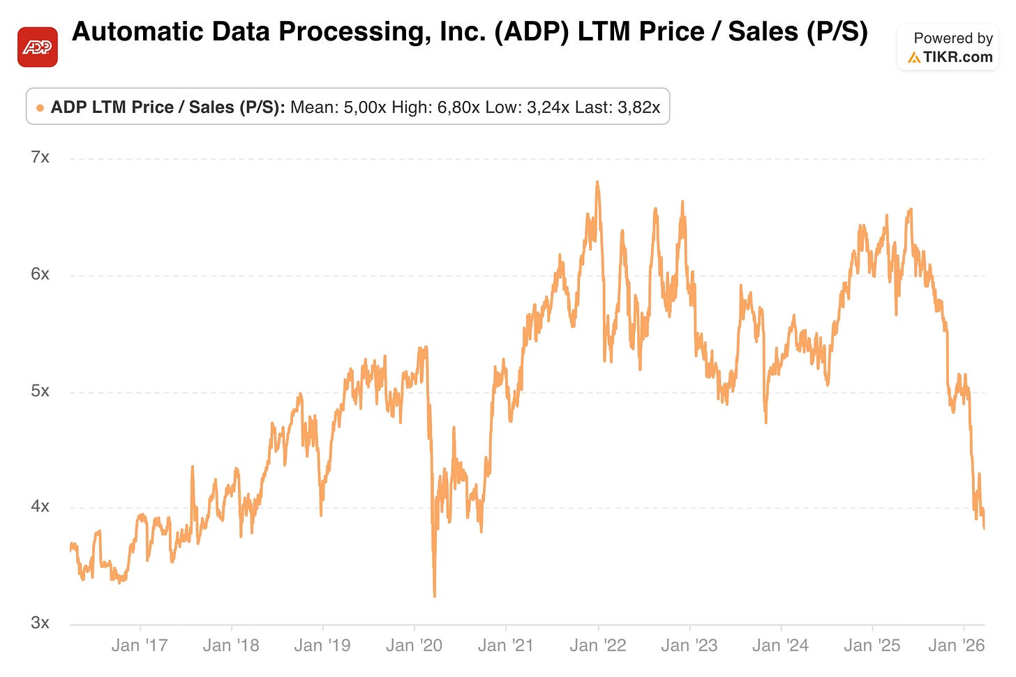 In addition to the 20% YTD decline, ADP is now trading at a Price-to-Sales (P/S) ratio of approximately 3.8. To put that in perspective, the market hasn't offered a valuation this attractive since the 2020 pandemic crash, a period when the global economy was at a complete standstill.